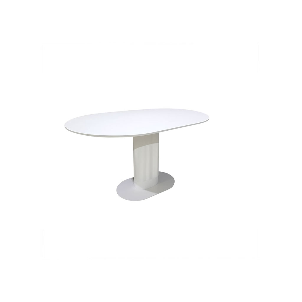 The SOLARO OVAL TABLE showcases modern elegance through its clean curves, seamless finish, and sculpted pedestal base. Designed as a refined centrepiece, its smooth oval top offers a spacious surface while maintaining a minimalist, luxurious aesthetic. The ribbed cylindrical pedestal provides both stability and visual character, making the Solaro a standout choice for contemporary dining, premium events, and sophisticated interior setups.